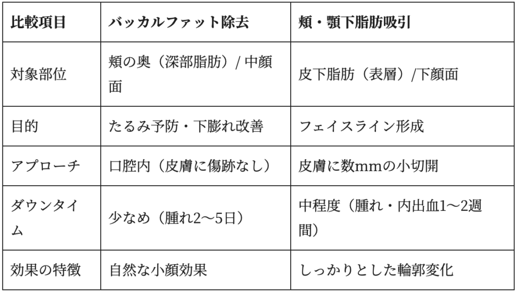 (例:脂肪吸引でフェイスラインを引き締め、バッカルファットで中顔面をすっきりさせる)