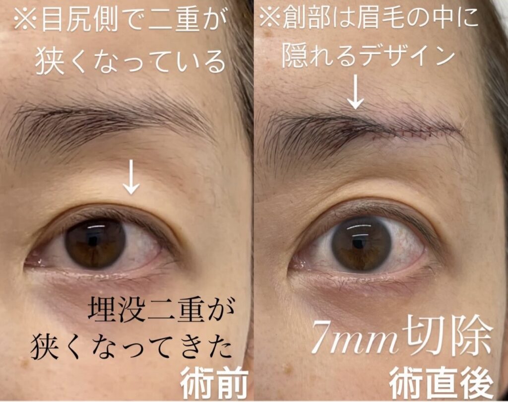ROOF切除を組み合わせることで、腫れぼったさや厚みを解消し、よりすっきりとした目元になります。